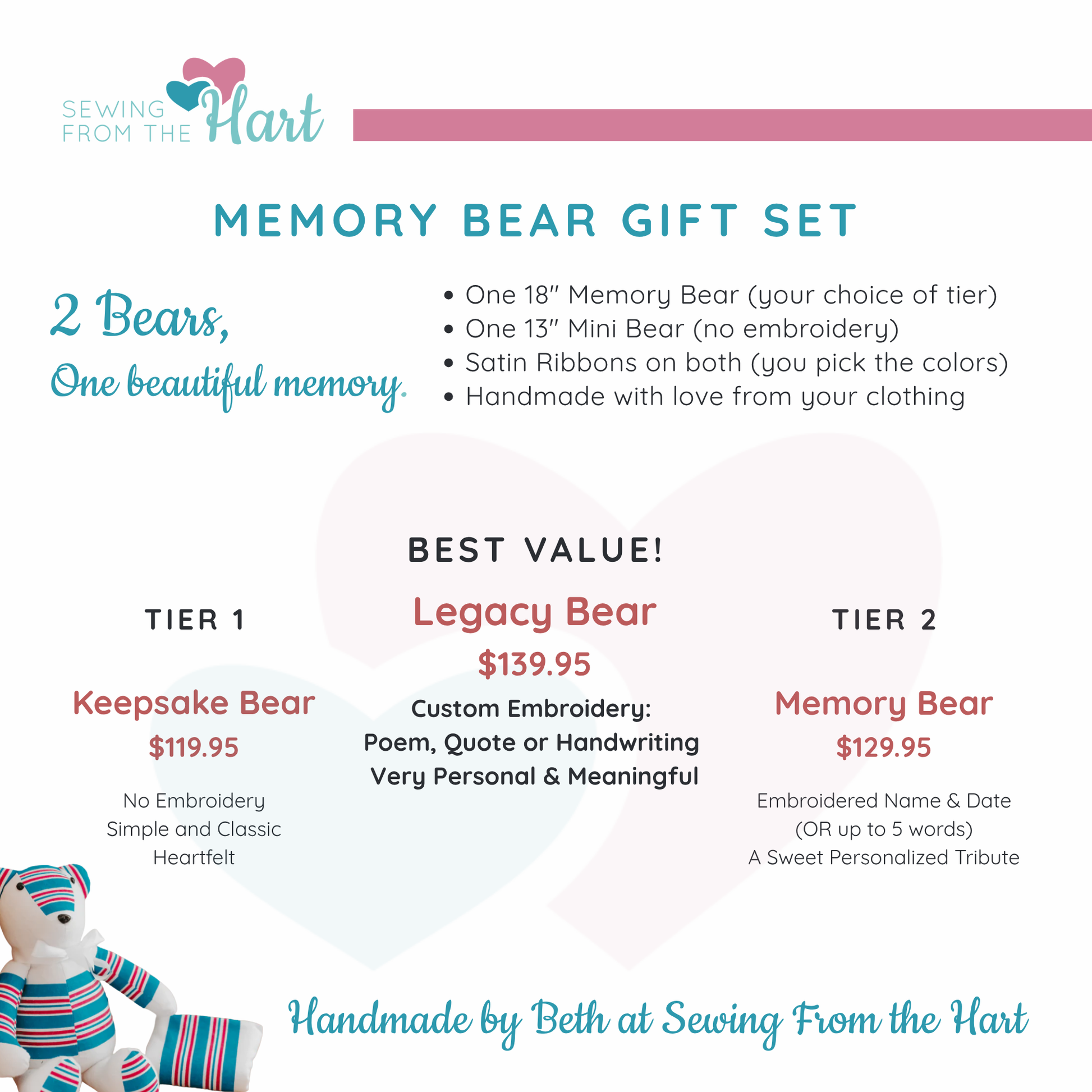 Each Memory Bear is handmade from clothing you provide and available in three meaningful styles, based on how personal you want to make it.